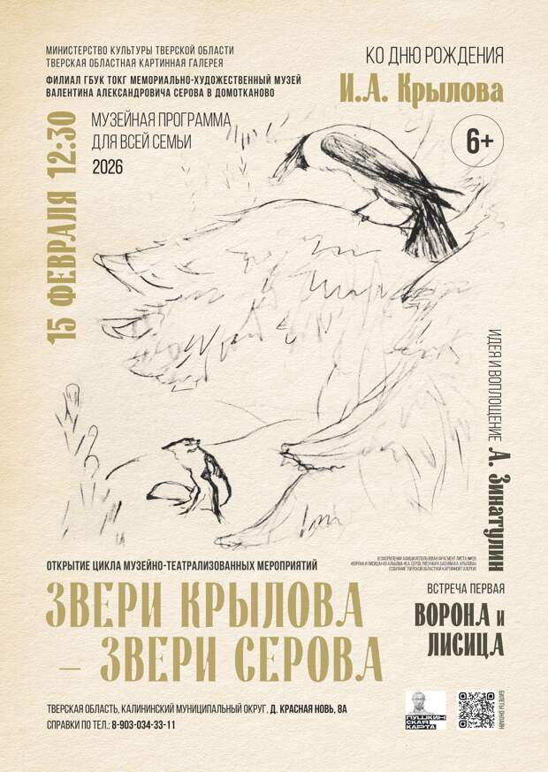 15 февраля в 12:30 в Музее Валентина Серова в Домотканово состоится открытие новой интерактивной музейной программы для всей семьи под названием «Звери Крылова – Звери Серова». Первая встреча, посвященная дню рождения И. А. Крылова, пройдет под знаком знаменитой басни «Ворона и лисица» — сообщает Тверская Областная картинная галерея.