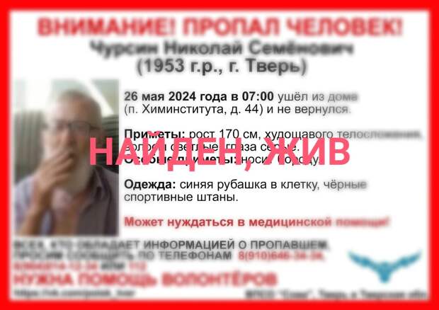 В Твери завершены поиски Николая Чурсина 1953 года рождения. Об этом сообщают волонтёры «Совы».