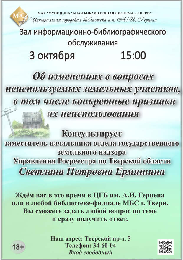 3 октября в Центральной городской библиотеке им. А.И. Герцена и филиалах МБС Твери состоится консультация по вопросам неиспользуемых земельных участков от специалиста Росреестра.
