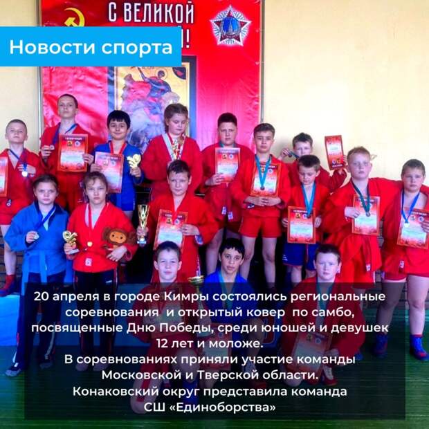 В Кимрах прошли областные соревнования и открытый ковер по самбо среди юношей и девушек 12 лет и моложе. Мероприятие, которое состоялось 20 апреля, посвящено Дню Победы.