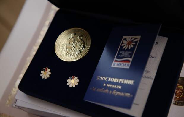 Медаль «За любовь и верность» является общественной наградой, учрежденной в 2008 году. На одной стороне награды изображены покровители Дня семьи, любви и верности – святые супруги Петр и Феврония Муромские, на другой стороне – ромашка, как символ любви и чистоты.