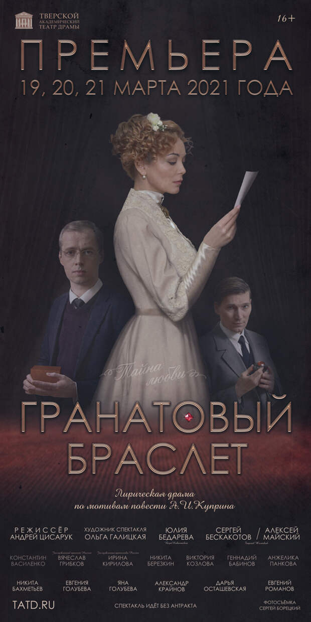 В Тверском академическом театре драмы состоится премьера спектакля по повести А.И. Куприна «Гранатовый браслет». Постановка столичного режиссера Андрея Цисарука взойдет на подмостки театра 19, 20 и 21 марта.