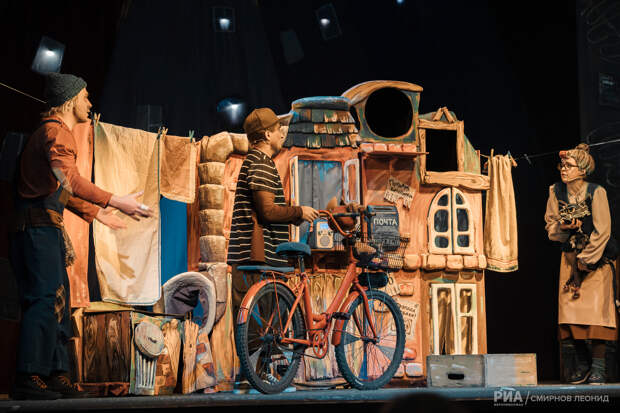 Оформлению сцены хочется уделить особое внимание — во дворе преобладают тёплые тона, деталей тоже довольно много: от почтового ящика до объявлений о пропаже собаки. Куклы очень гармонично сочетались с общим планом, во многом благодаря профессиональной работе актёров.