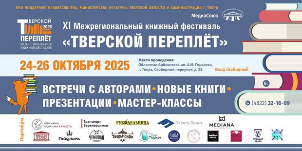 С 24 по 26 октября в Твери пройдёт ХI межрегиональный книжный фестиваль «Тверской переплёт» (6+). В этом году он посвящен 80-й годовщине Победы в Великой Отечественной войне и 165-летию Тверской областной универсальной научной библиотеки им.