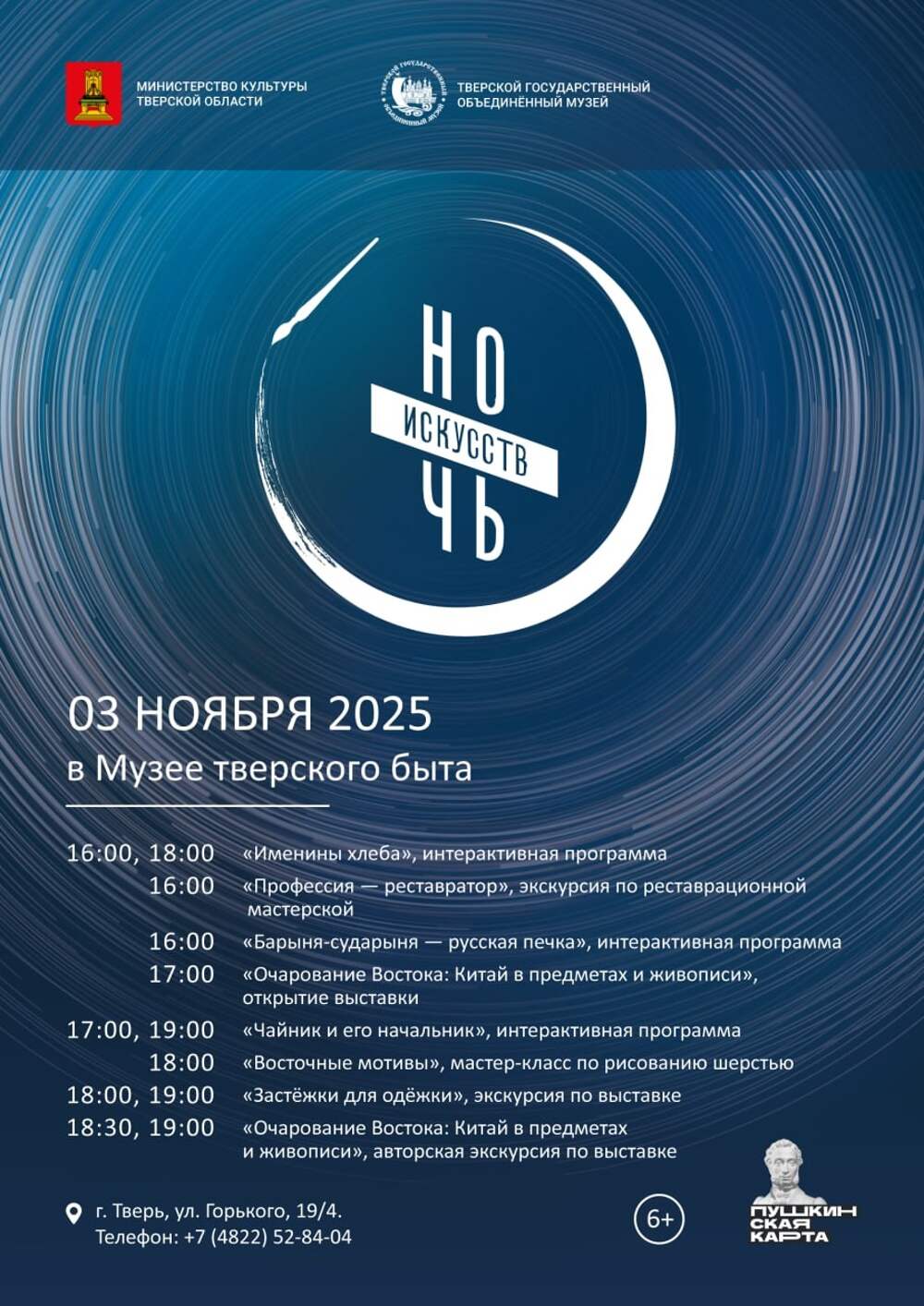 3 ноября в Музее тверского быта жителей региона ожидает «Ночь искусств» с разнообразными интерактивными программами, экскурсиями и мастер-классами с 16:00 до 19:00. В рамках акции запланированы творческие и познавательные мероприятия: «Именины хлеба» и «Барыня-сударыня русская печка»